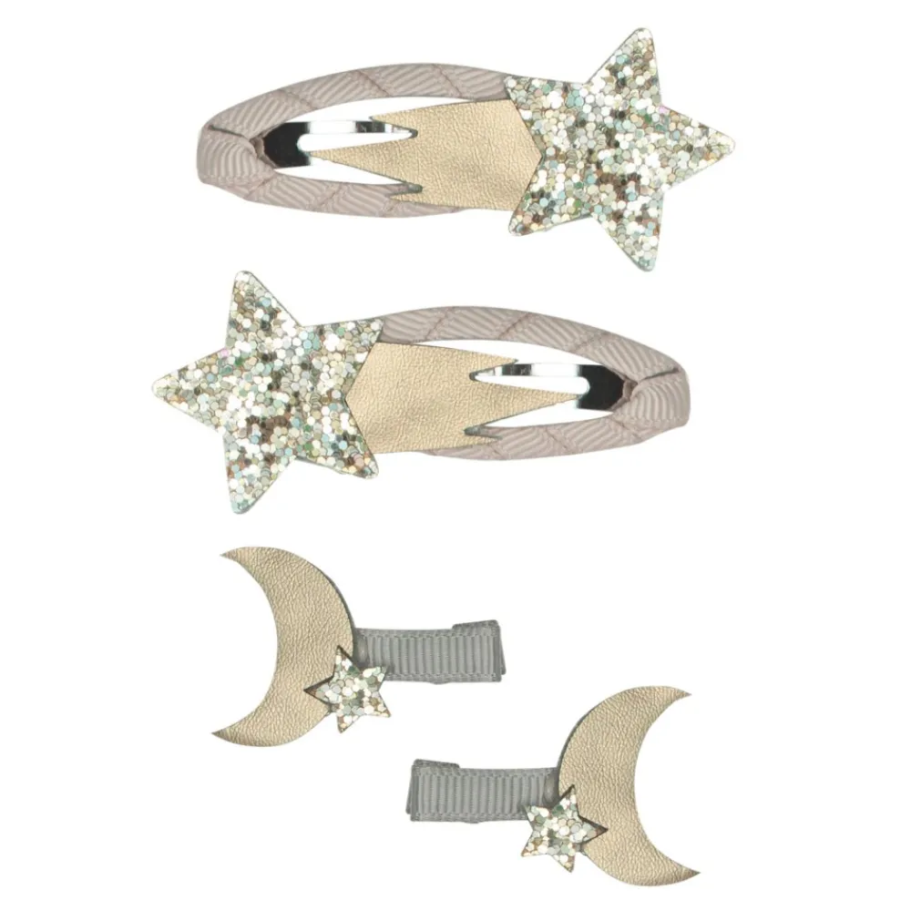 Laissez briller vos petites étoiles avec nos nouveaux clips scintillants pour le ciel nocturne ! De minuscules lunes et des étoiles scintillantes égayeront à coup sûr toute coiffure ennuyeuse !