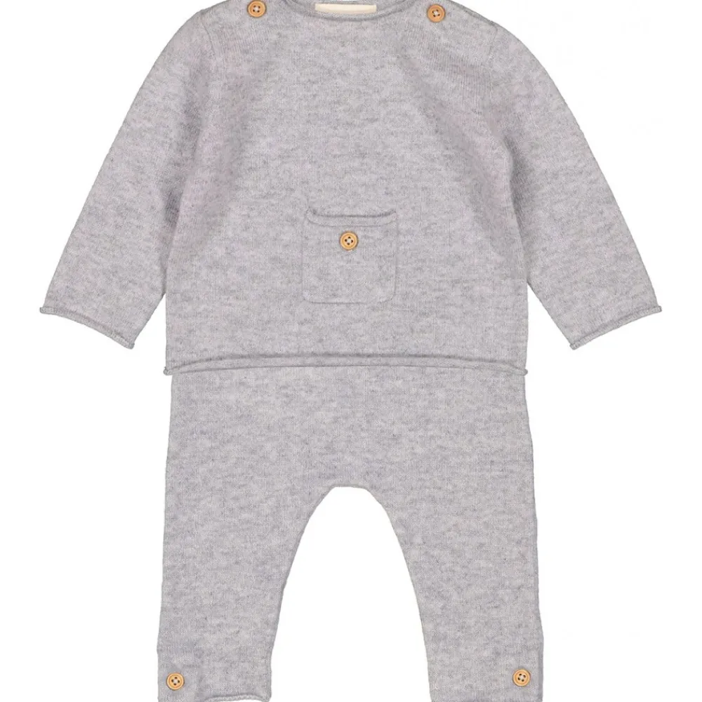 Détails : Ensemble en cachemire ultra doux composé d’un pull, fermé par des boutons en bois aux épaules, poche plaquée sur le devant, et d’un legging, ceinture élastiquée à la taille, petits boutons en bois aux chevilles.